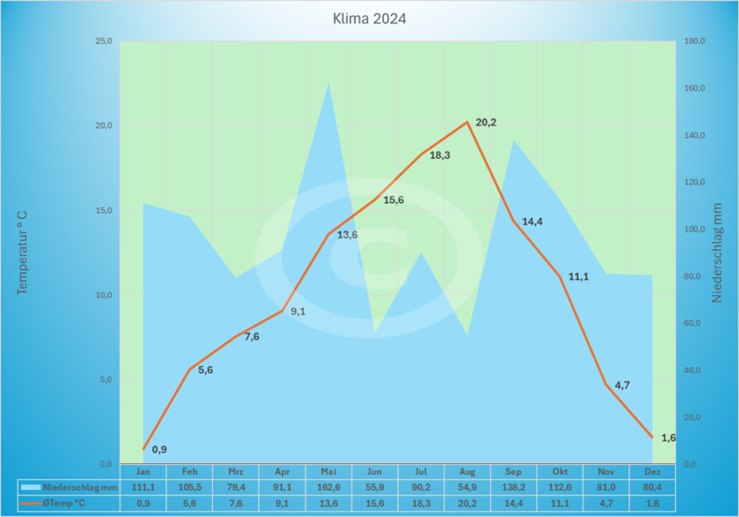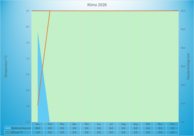 Die Diagramme zeigen die Niederschlags- und Temperaturentwicklung des Jahres (blau = Niederschlag in Liter je qm, rot = Entwicklung der Durchschnittstemperatur).