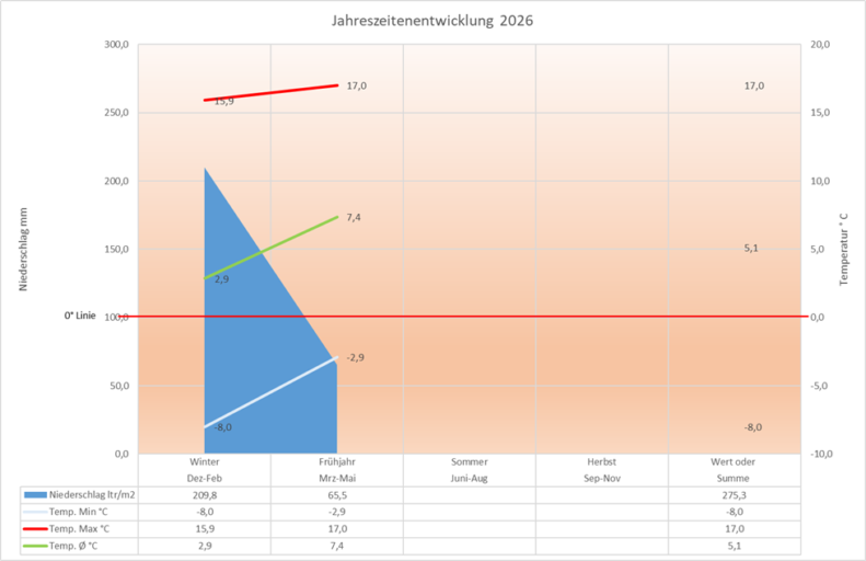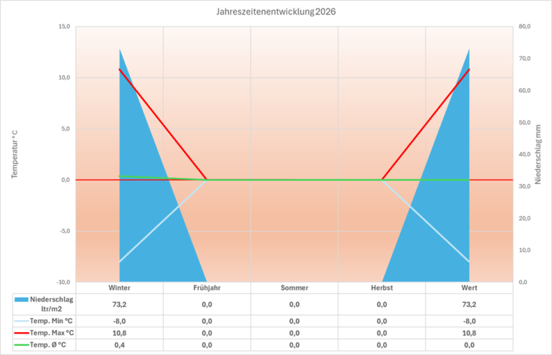 Die Jahreszeiten entstehen durch die schiefe Neigung der Erdachse. Nachfolgend wird die Wetterentwicklung während des Wetterjahres nach den meteorologischen Jahreszeiten dargestellt. Die Erfassung erfolgt ab dem Jahr 2013.