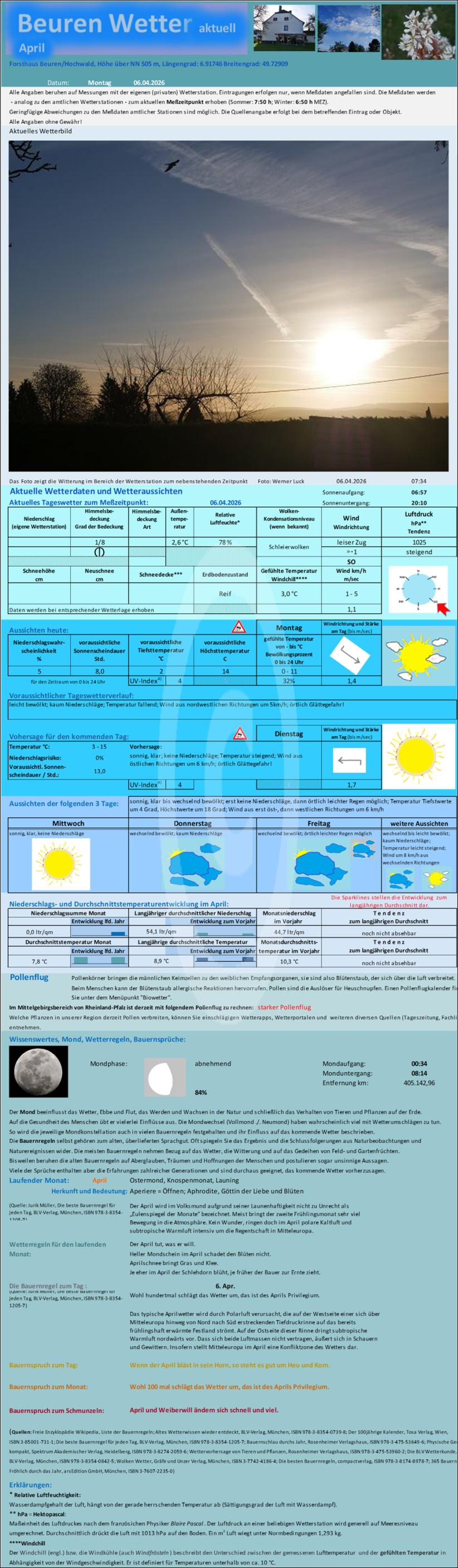 In der folgenden Bilddatei "Beuren_Wetter" sind die aktuellen Tageswetterdaten der Wetterstation Forsthaus Beuren aufgeführt. Neben den aktuellen Wetterdaten wird eine Wettervorhersage für 6 Tage vorgenommen, weiterhin finden Sie die aktuellen Monddaten, die Zeiten von Sonnenauf- und -untergang sowie Wissenswertes wie Wetterregeln, Bauernsprüche u.a.