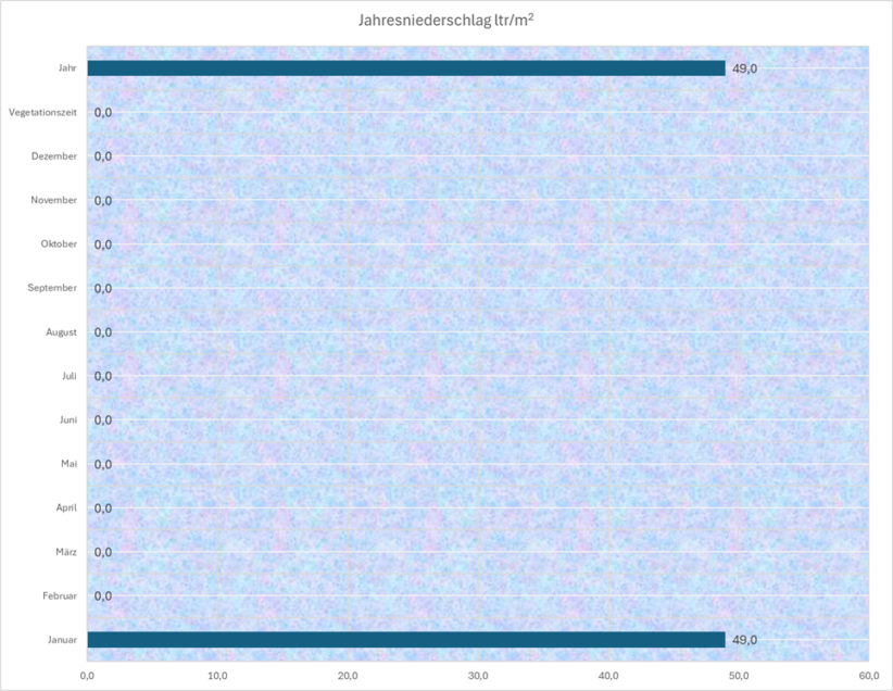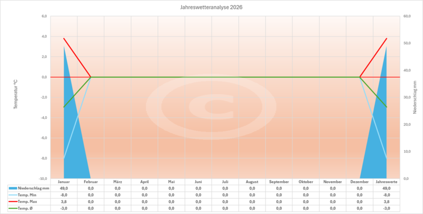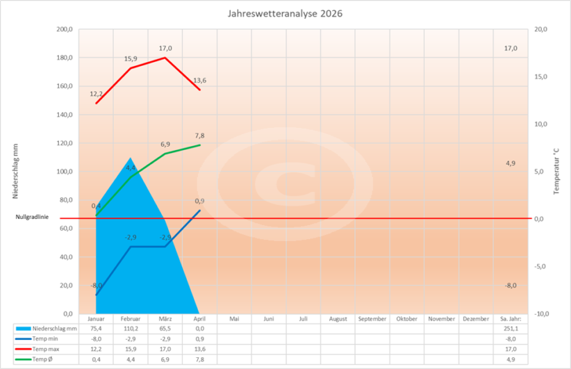 Im Diagramm "Niederschläge lfd. Jahr" wird die Entwicklung der Niederschläge im Jahresverlauf dargestellt. Das Diagramm "Jahrestemperaturwerte" zeigt die Entwicklung der monalichen Min-, Max- und Durchschnittstemperaturen. Schließlich sehen Sie im Diagramm "Jahreswetteranalyse" die Entwicklung von Temperatur und Niederschlag im laufenden Jahr.