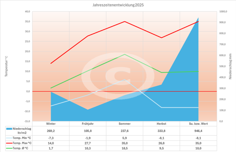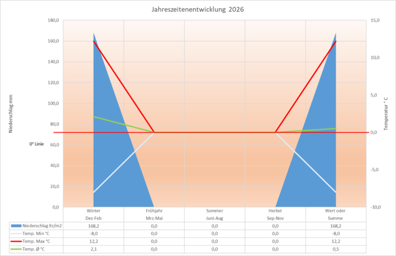 Die Jahreszeiten entstehen durch die schiefe Neigung der Erdachse. Nachfolgend wird die Wetterentwicklung während des Wetterjahres nach den meteorologischen Jahreszeiten dargestellt. Die Erfassung erfolgt ab dem Jahr 2013.
