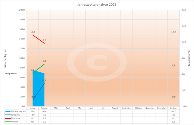 Im Diagramm "Niederschläge lfd. Jahr" wird die Entwicklung der Niederschläge im Jahresverlauf dargestellt. Das Diagramm "Jahrestemperaturwerte" zeigt die Entwicklung der monalichen Min-, Max- und Durchschnittstemperaturen. Schließlich sehen Sie im Diagramm "Jahreswetteranalyse" die Entwicklung von Temperatur und Niederschlag im laufenden Jahr.